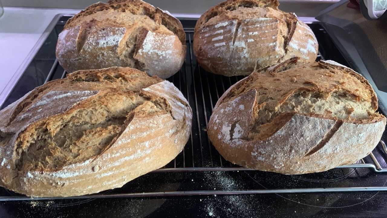 Herrlich frisches Brot. Mit Weizensauerteig, Tritordeum und Weizenmehl. Fleur de Sel, Olivenöl.