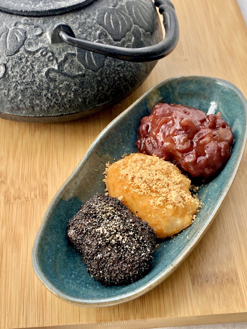 Snart är det vårdagjämning och då är det tradition i Japan att göra och äta botamochi, en japansk sötsak. Botamochi görs av klibbigt ris som formas till bollar, fylls med söt bönmassa och täcks med smaksättare. Idag smaksatte jag med rostat sojabönspulver och vallmofrö och så lite socker. Jättegott till grönt te!