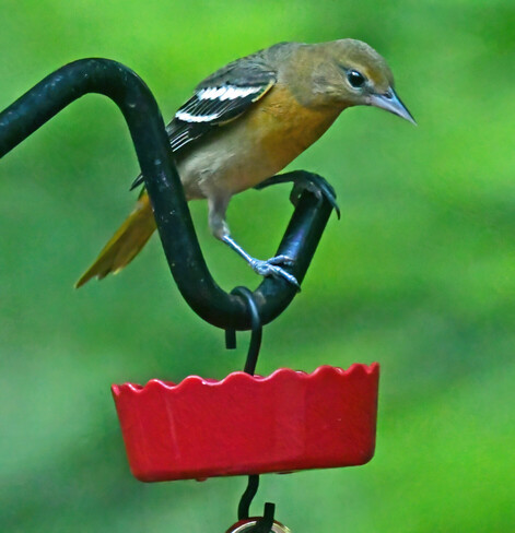 This female or juvenile bird landed on my nectar feeder--proof that the Baltimore orioles are starting their migration back south. I will put out jelly for it tomorrow--perhaps it will come back and bring some friends. (Pictures are soft because it was dark and rainy when she visited.) #birds #birding #birdsofmastodon #birdphotography #nature #naturephotography #baltimoreoriole