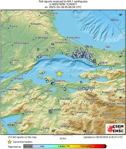 #Earthquake 29 km NE of #Bandırma (#Turkey) 19 min ago (local time 08:28:53). Updated map - Colored dots represent local shaking & damage level reported by eyewitnesses. Share your experience via:
