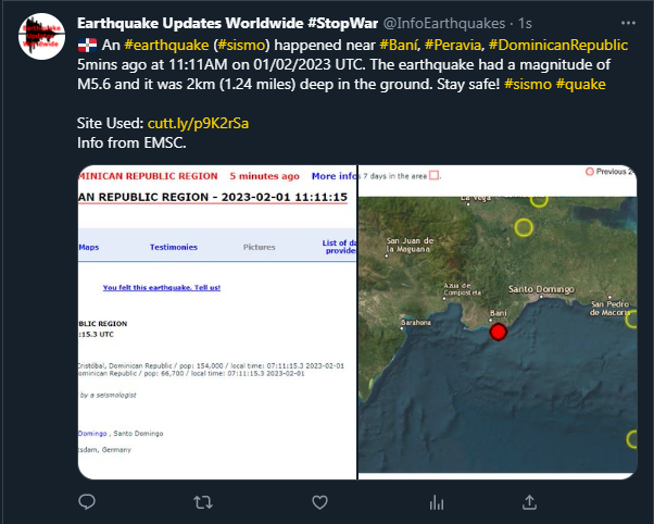 🇩🇴 An #earthquake (#sismo) happened near #Baní, #Peravia, #DominicanRepublic 5mins ago at 11:11AM on 01/02/2023 UTC. The earthquake had a magnitude of M5.6 and it was 2km (1.24 miles) deep in the ground. Stay safe! #sismo #quake