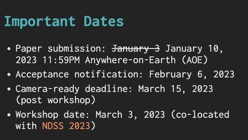 The deadline for the call for papers for the Workshop on Binary Analysis Research (BAR) has been extended to January 10, 2023 (AoE). More details available here: https://bar2023.github.io.