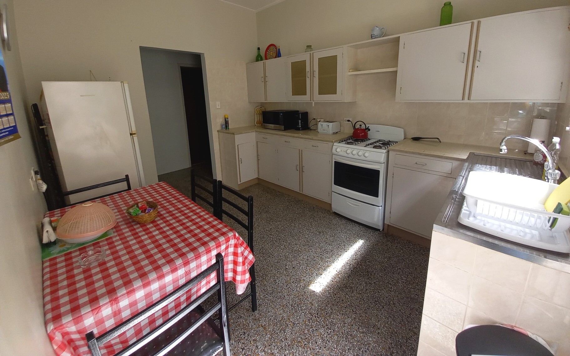 The large kitchen of our upstairs apartment is well equipped with coffee maker, microwave, toaster, gas stove, and fridge.