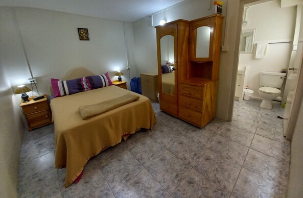 The bedroom of our downstairs apartment features a comfy double bed, lots of storage, air conditioning, and ensuite bathroom 👍🏽