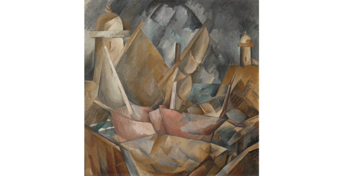 Picasso and Braque worked in creative dialogue, breaking down and reformulating the representation of objects and their structure. This painting is the first fully realized example of Braque’s early Cubist style. He described the English Channel coast in severe geometries and a sober palette. His compressed treatment of space and use of a shifting perspective seems to propel the two sailboats forward.