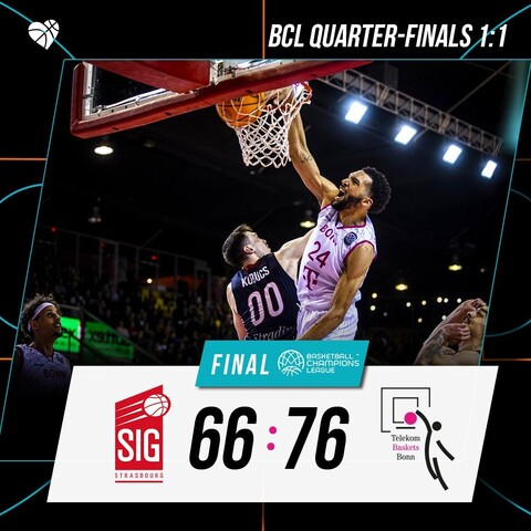 Die #Telekom #Baskets #Bonn gewinnen das 2. Spiel im Viertelfinale der #Basketball #ChampionsLeague bei der SIG #Strasbourg mit 76:66 und erzwingen damit ein Entscheidungsspiel am nรคchsten Dienstag (18.4., 20:00) im heimischen #TelekomDome.