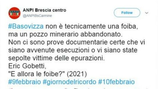 ANPI Brescia fa affermazioni storicamente corrette sulla cosiddetta "foiba" di #Basovizza (non è una foiba ma un pozzo minerario e non risulta che LÌ sia mai stato 'infoibato' nessuno) ma, viene zittito e tacciato di "negazionismo" da persone che non sono in grado di portare una sola fonte in grado di smentire il tweet di ANPI Brescia.