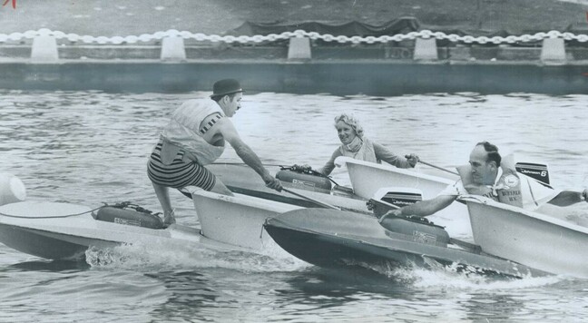 Scarborough Controller Joyce Trimmer battles Jim Lang, mayor of Bracebridge, and Stan Makowski, mayor of Buffalo, in the annual Mayors' Bathtub Derby at the CNE in Toronto on Aug. 21, 1975.