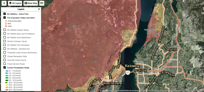 30,000 people now on evacuation order in BC alone. 36,000 more in BC are on alert. My sky 300km from the nearest big fire (#Kookipi) is heavy with smoke. Most of the evacuated are around #Kelowna and #WestKelowna. I've included the previous evac picture along with the new one so you can see how it has changed.