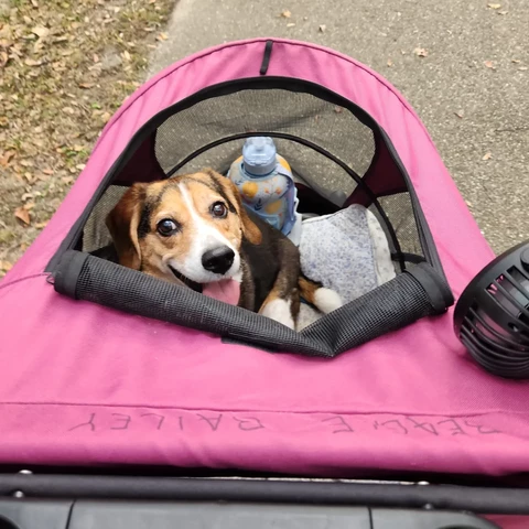 (Poor guy has had three knee surgeries, so he has a stroller for when his knee is bothering him.