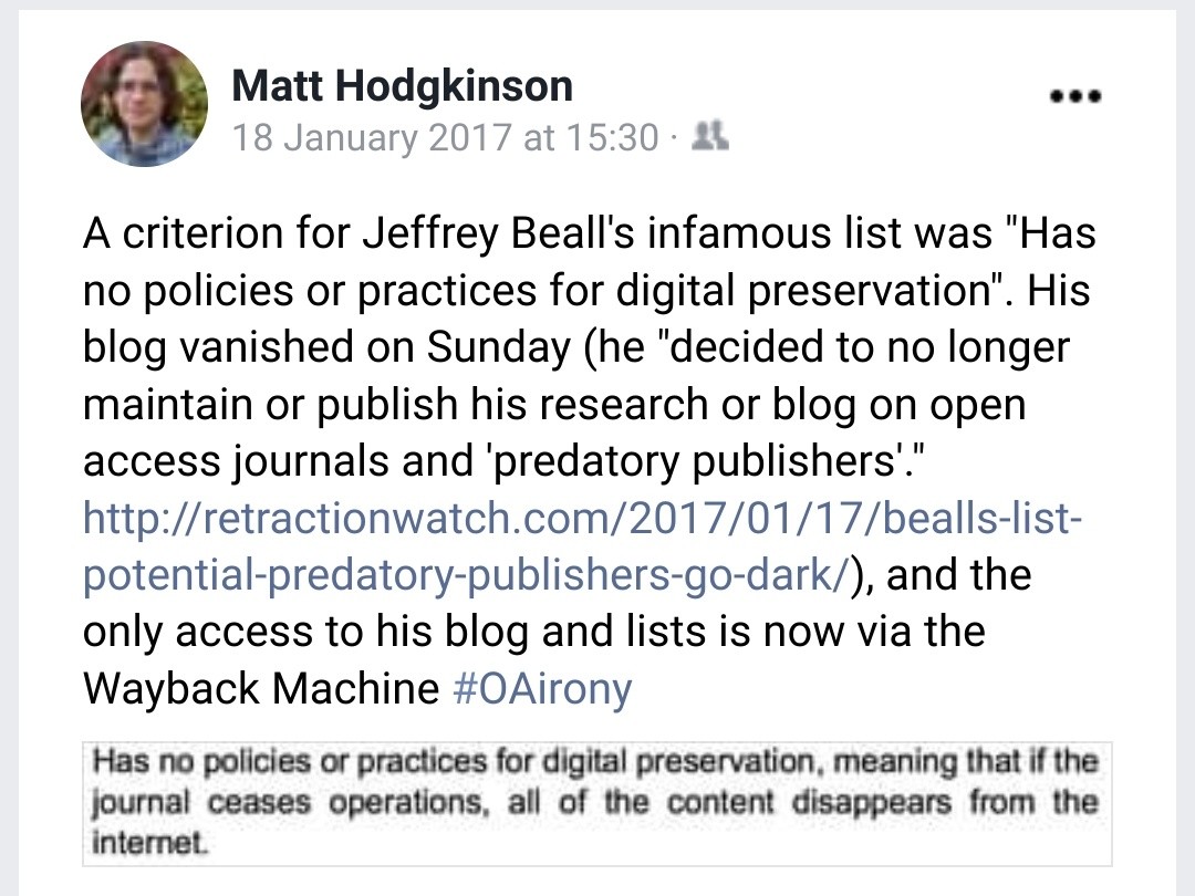 A criterion for Jeffrey Beall's infamous list of 'predatory journals' was "Has no policies or practices for digital preservation". His own blog vanished in January 2017 without being formally archived, though various copies live on.