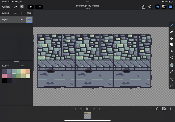 Rough pixel art for some brownstones. Not too sure on the windows or the tree, as a whole i like it pretty well! Tomorrow I'll cut this into some godot tilemaps.