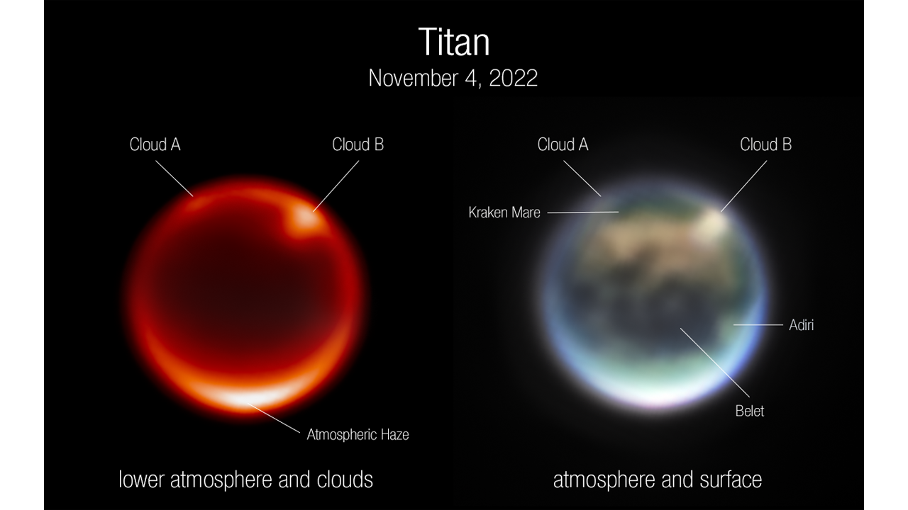 #JWST has spotted active methane clouds on #Titan! https://blogs.nasa.gov/webb/2022/12/01/webb-keck-telescopes-team-up-to-track-clouds-on-saturns-moon-titan/ #BedtimeScience