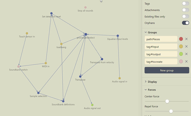 Back to the Exquisite Engine (#PureData + #Bela setup) today after about a month away from it, I felt I had to remind myself what I'd done in the code. Having set up an #Obsidian vault for the research side of this project, I thought I'd test how it goes to visualise the structure of the code. So far so good: I found (& fixed) a point where I could eliminate a step & am clearer on the next changes & where to make them. Onwards! #composition #CyborgSoloists @cyborgsoloists