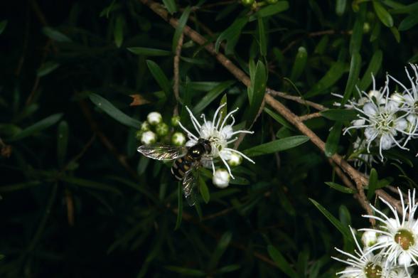 I was trying to get a good shot of Burgan blossom (Kunzea) when this Hover Fly landed - and pretended to be a native bee.