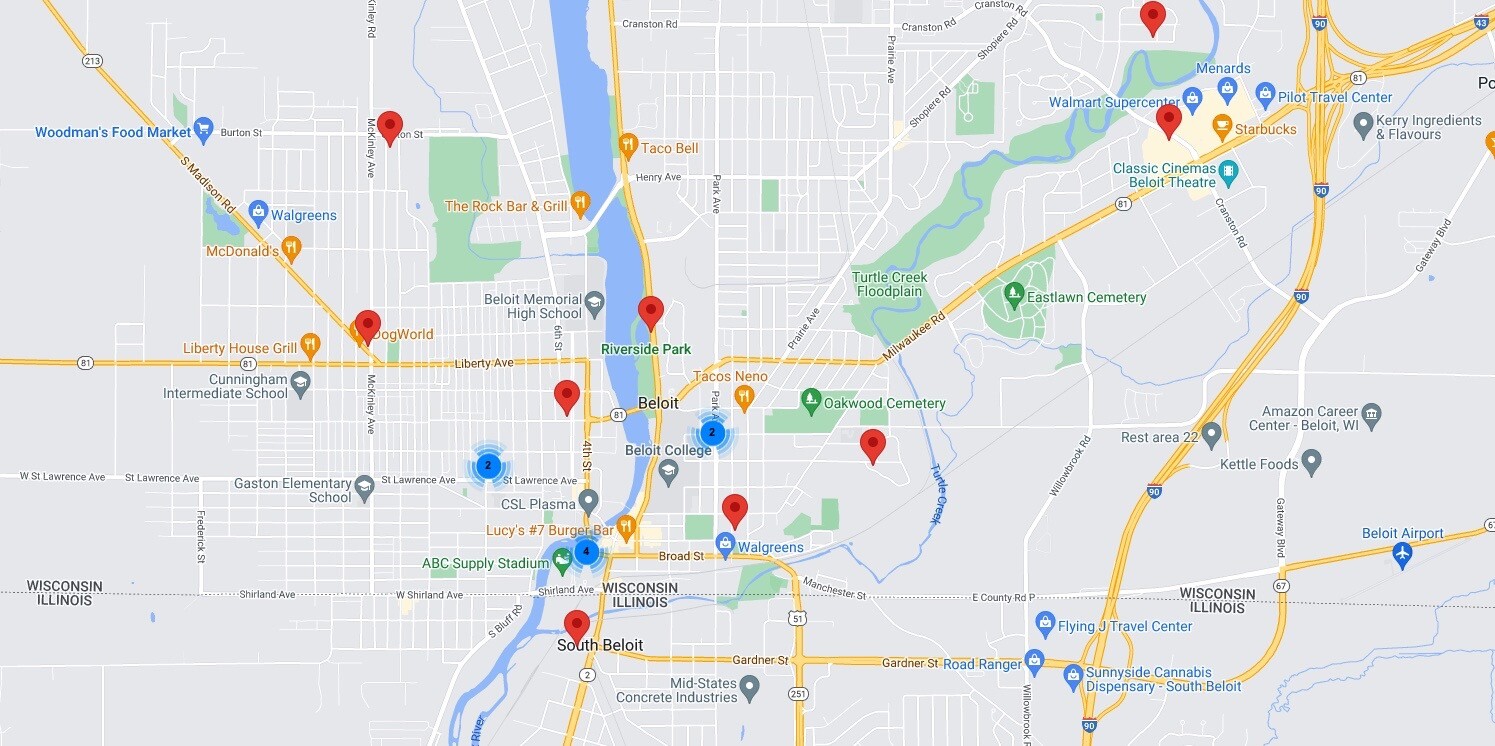 This is a map of Beloit, my new hometown, with pins dropped in for “little free libraries.” This map has 17 of them, and I think that’s incomplete.