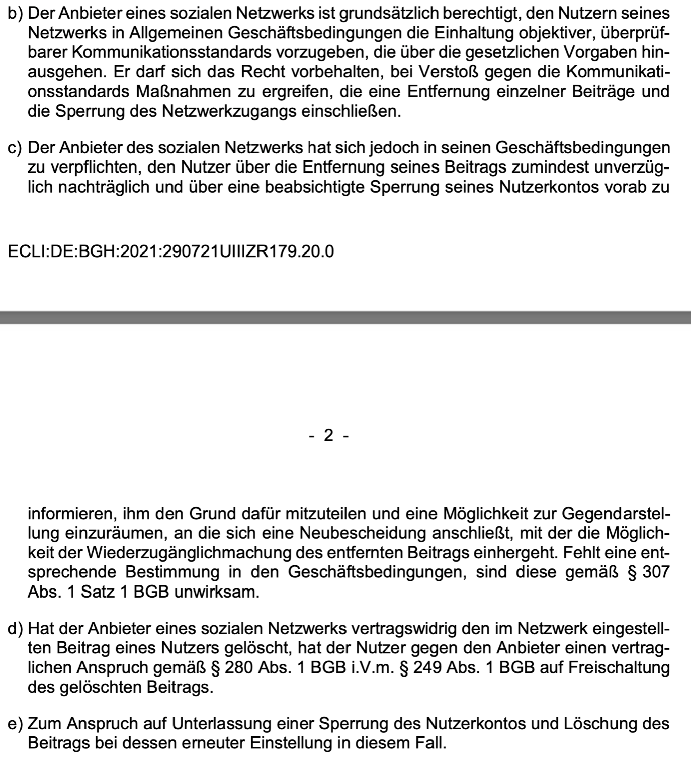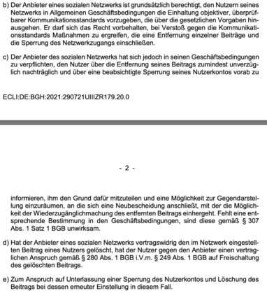 i.S. Rechtmäßigkeit einer vorübergehenden Teilsperrung des Facebook-Benutzerkontos und der Löschung der Nutzer-Kommentare durch Facebook wegen des Vorwurfs der "#Hassrede"