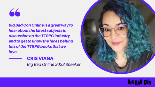 Speaking of the new Lead Graphic Designer at Evil Hat Productions... "Big Bad Con Online is a great way to hear about the latest subjects in discussion on the TTRPG industry and to get to know the faces behind lots of the TTRPG books that we love." - Cris Viana #BigBadOnline 2023 Speaker
