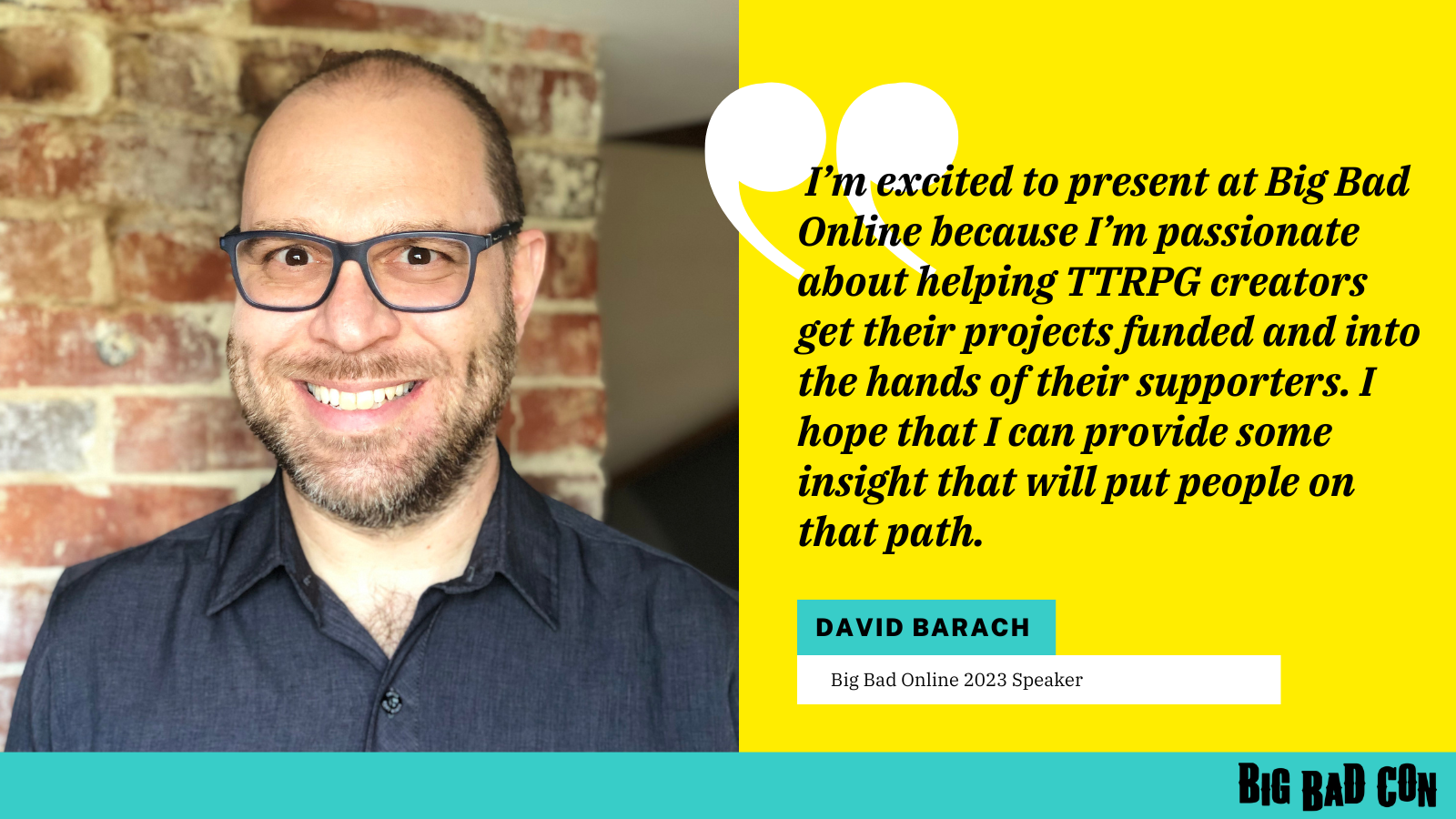 "I’m excited to present at Big Bad Online because I’m passionate about helping TTRPG creators get their projects funded and into the hands of their supporters. I hope that I can provide some insight that will put people on that path." - David Barach #BigBadOnline 2023 Speaker