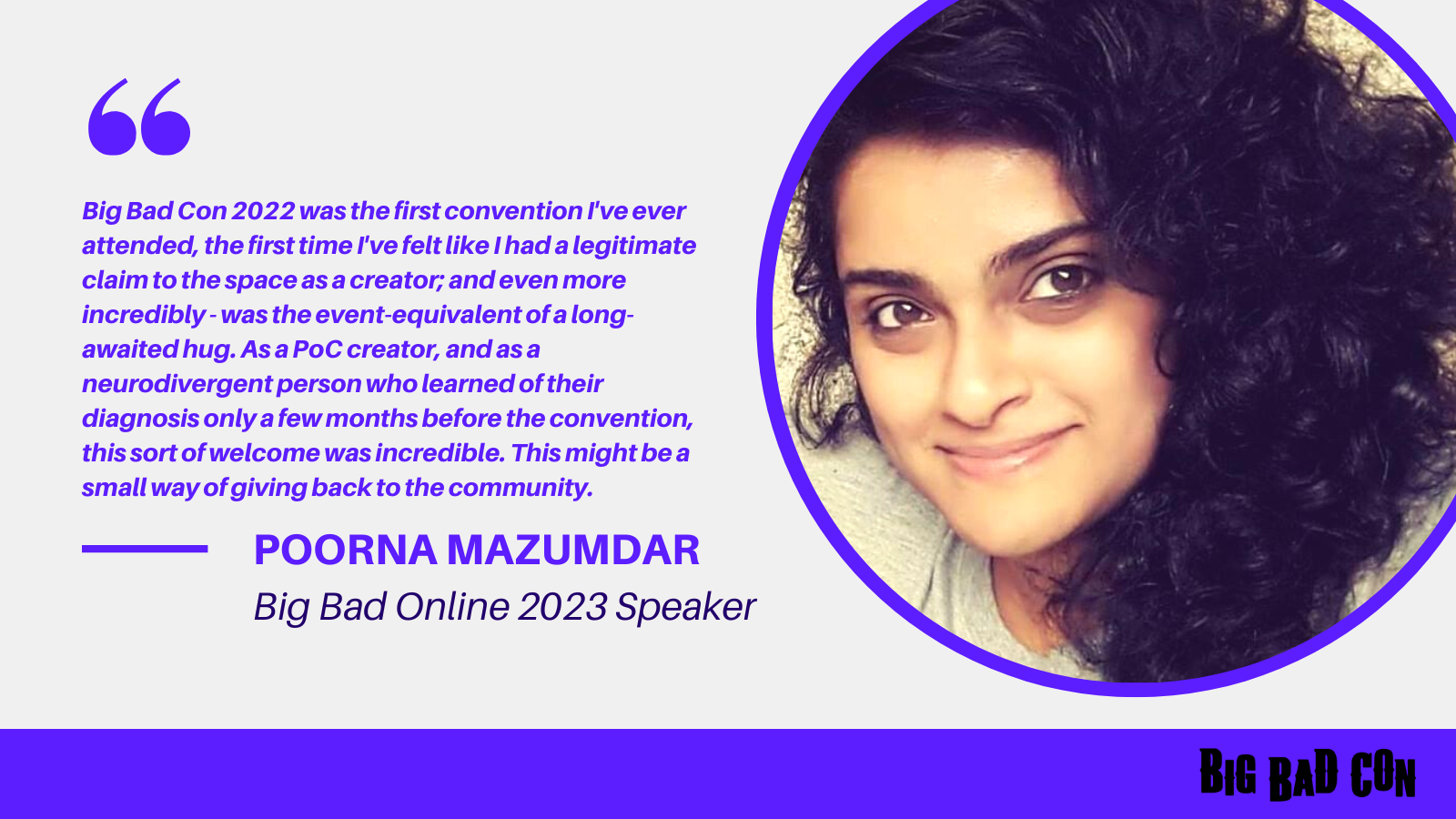 "Big Bad Con 2022 was the first convention I've ever attended, the first time I've felt like I had a legitimate claim to the space as a creator; and even more incredibly - was the event-equivalent of a long-awaited hug. As a PoC creator, and as a neurodivergent person who learned of their diagnosis only a few months before the convention, this sort of welcome was incredible. This might be a small way of giving back to the community." - Poorna Mazumdar #BigBadOnline 2023