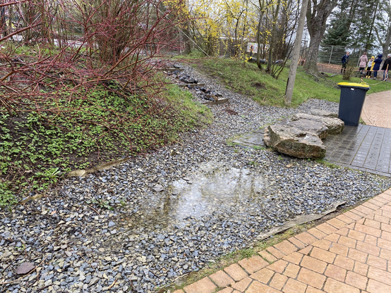 Geniale Lösung für eine Möglichkeit, dass Schüler:innen im Schulgelände Wasser erleben können: Vom höher gelegenen Schulhof läuft Regenwasser über eine Kaskade in eine flache Versickerungsmulde. #bildungfuernachhaltigeentwicklung #schulgelaende #outdoorpaedagogik