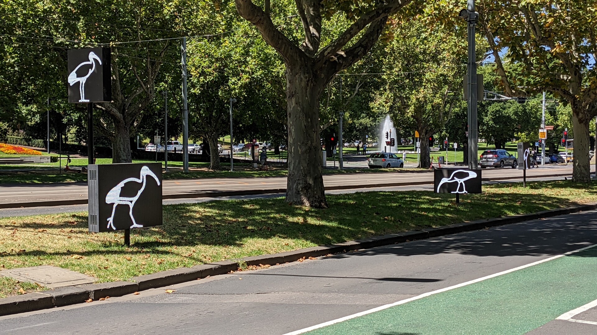 Interesting collection of LED bin chickens in St Kilda Road Melbourne by artist Julian Opie #binchicken