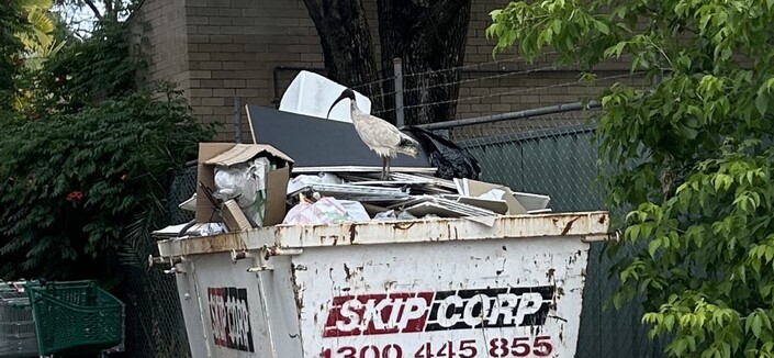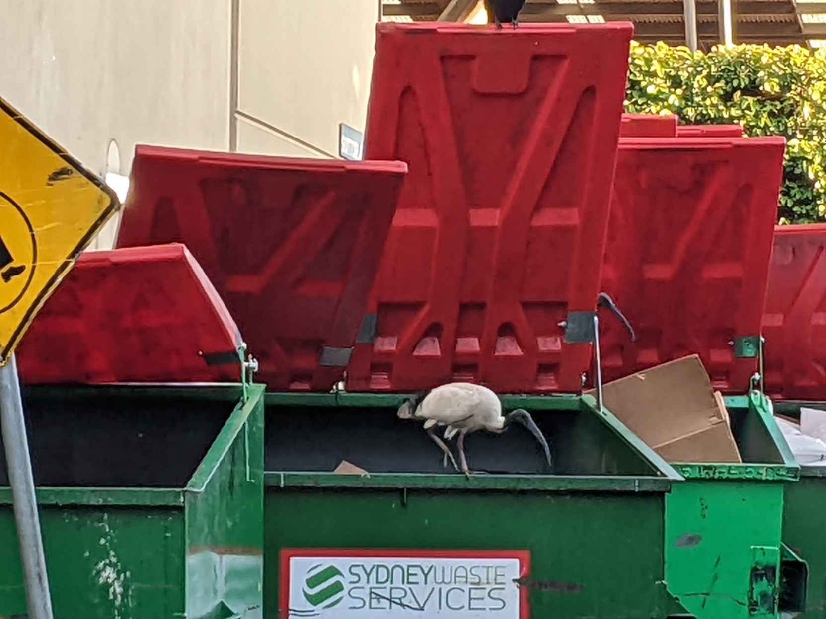 The infamous Binchicken (aka Australian White Ibis) and a juvenile Torresian Crow, trying to work out which is its best side.