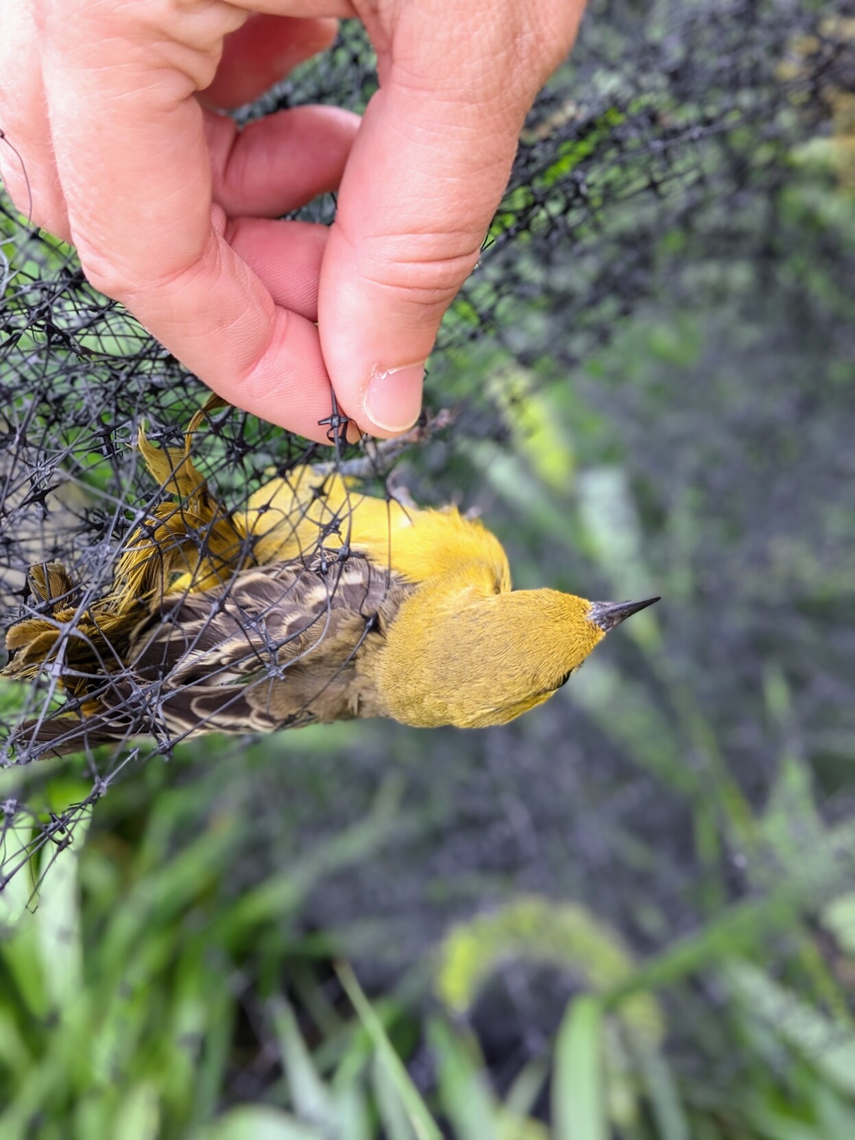 Don't worry, we cut him out safely and he's unharmed (as far as we could tell). He even left us a feather as he flew off.