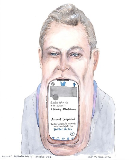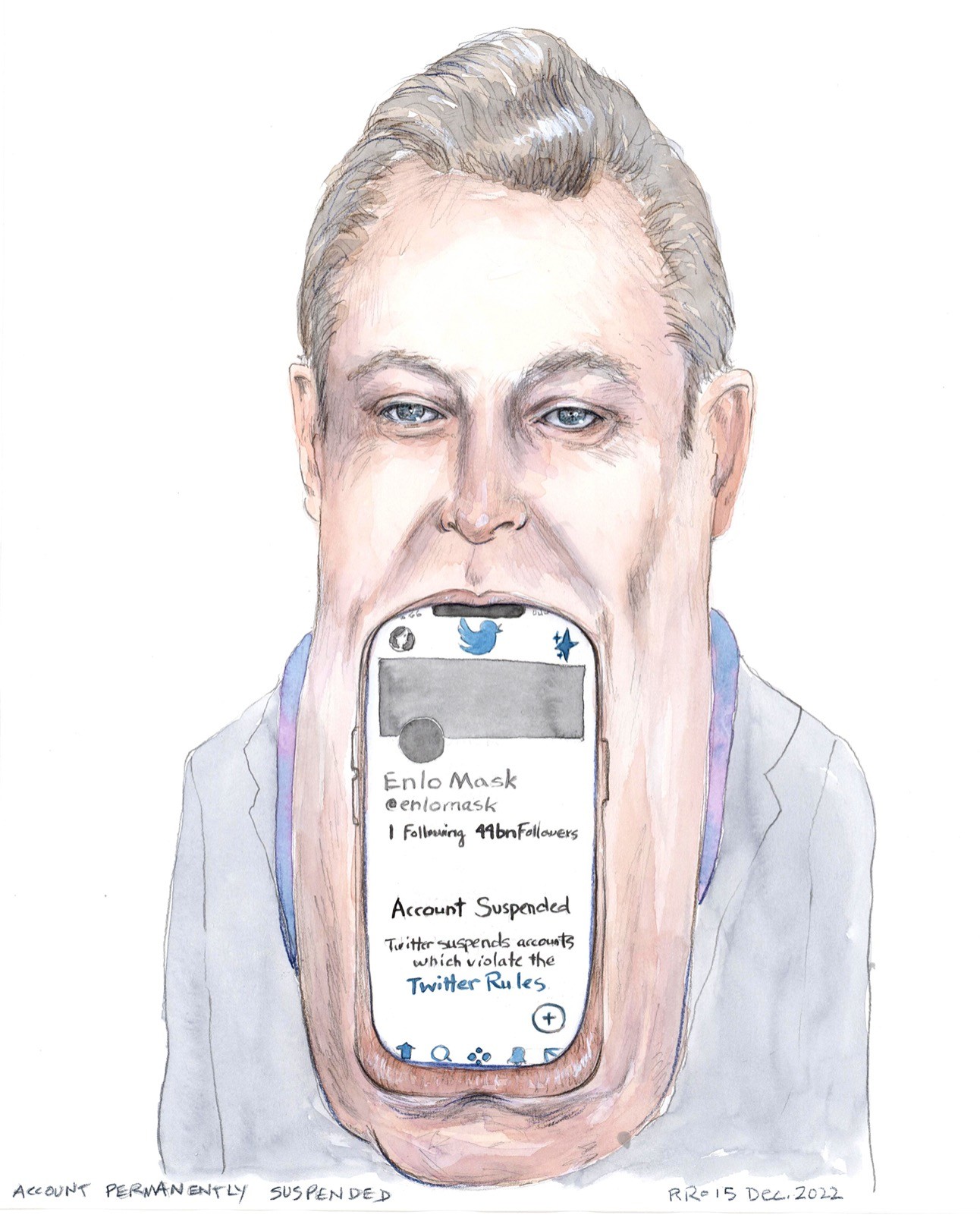 I suspect he's oredi installed his Neurolink (artificial ignorance) device and that it has burrowed deeply into Enlo Mask's hard, thick skull. Watercolors, pencils and profound mistrust on 11 x 14" Canson Mix Media paper. #birdplace #ELONgate #watercolors #MastoArt