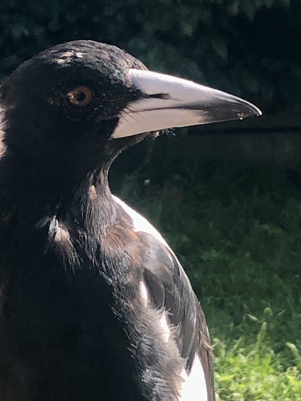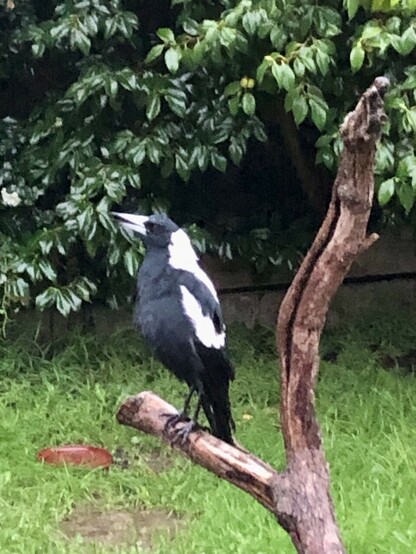 A juvenile Currawong who lives in the front, who occasionally jumps in the front bath, makes a surprise visit in the yard. No magpies around, so Lofty is safe, for now.