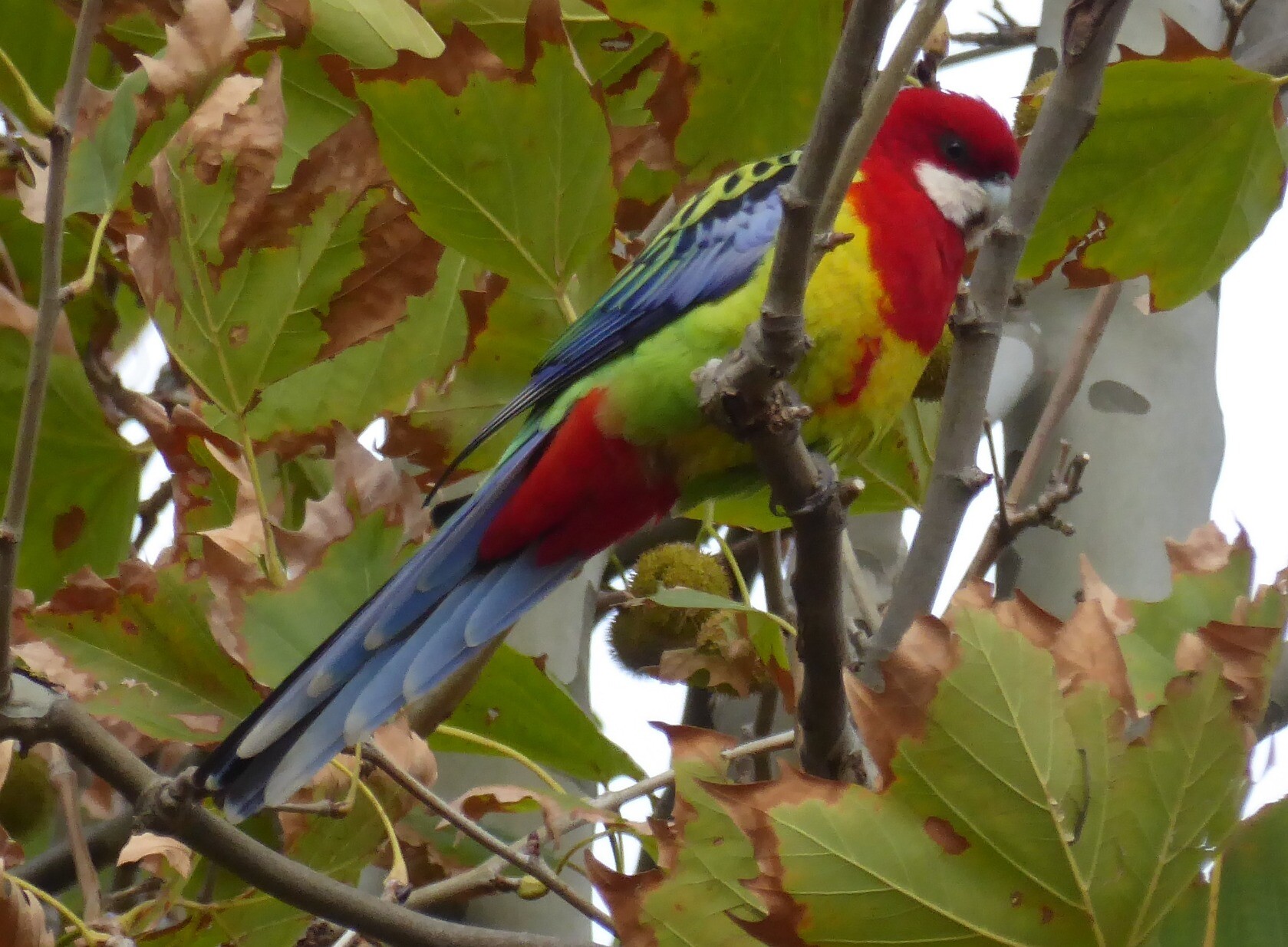 We an Eastern Rosella visit our street, happily sitting in a tree right outside our place. Such colourful birds.