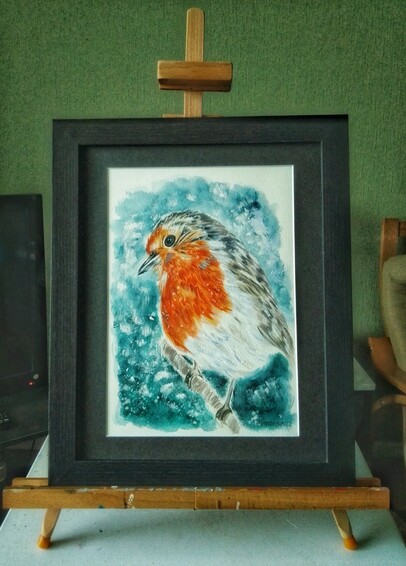 Good morning. I have this little chap in his frame ready to travel to his new home. He's a one off original piece, created using watercolour on heavy watercolour paper. The little Robin Redbreast remains ever popular with people and are known as friendly little birds, often associated with loved ones who have crossed over. Take care and have a good day.