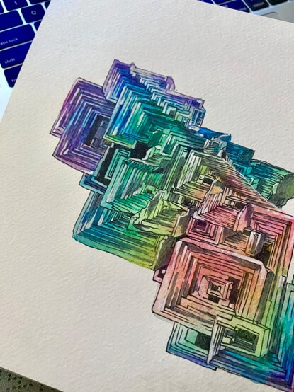 A mixed media drawing of a bismuth crystal that I drew! When this metal is melted down it can cool into beautiful crystalline formations like this! As the metal interacts with the air, it oxidizes into a beautiful rainbow coating, which I think looks entirely magical.