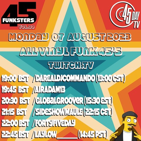 If you like funk, then tune in tonight to the 45 Funksters raid train on Twitch - every DJ with a 45 minute set, all playing on 45s only!
