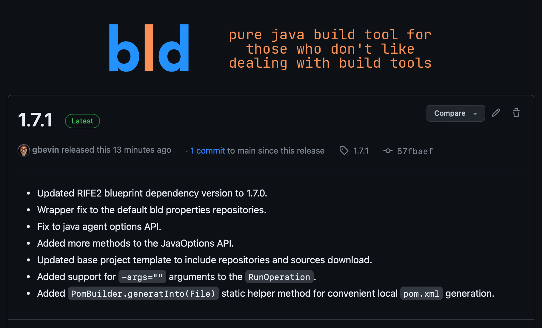 Get it through Homebrew, @sdkman_ , or a plain old jar or zip file: https://github.com/rife2/bld/releases/tag/1.7.1