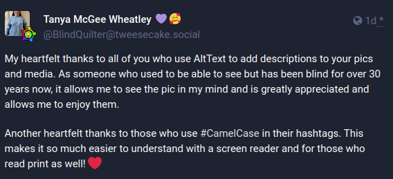 @tempertemper If you think Twitter without the #accessibility team is bad, wait until you see #Reddit. I’m a mod of r/blind, and it's been an exhausting couple of months. #Blind users--and #disabled users in general--have essentially been deplatformed from Reddit, and Reddit still is not prioritizing #a11y.