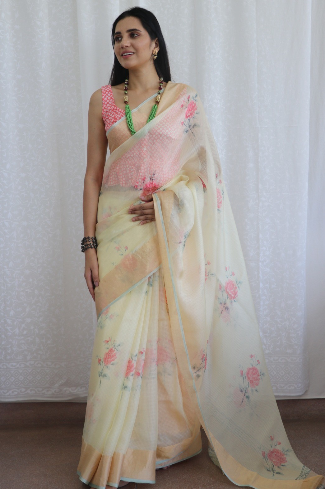 Sarees were knotted for over 5000 years. wrinkles are a regular feature in the development of sarees. Since early on, ladies ensured that the saree was made with perfect pleats. The hand-printed saree elegance lies in the fans-shaped wrinkles on the top and the bottom.
