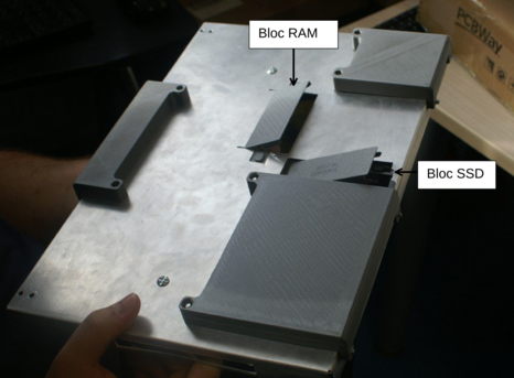 Ce prototype comporte 2 blocs : la RAM et le SSD. Dans notre version finale, 6 blocs seront prévus (processeur, CG, SSD, RAM, ventilateur, batterie + clavier, écran, pad détachable).