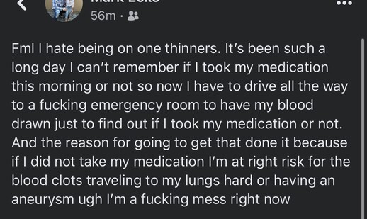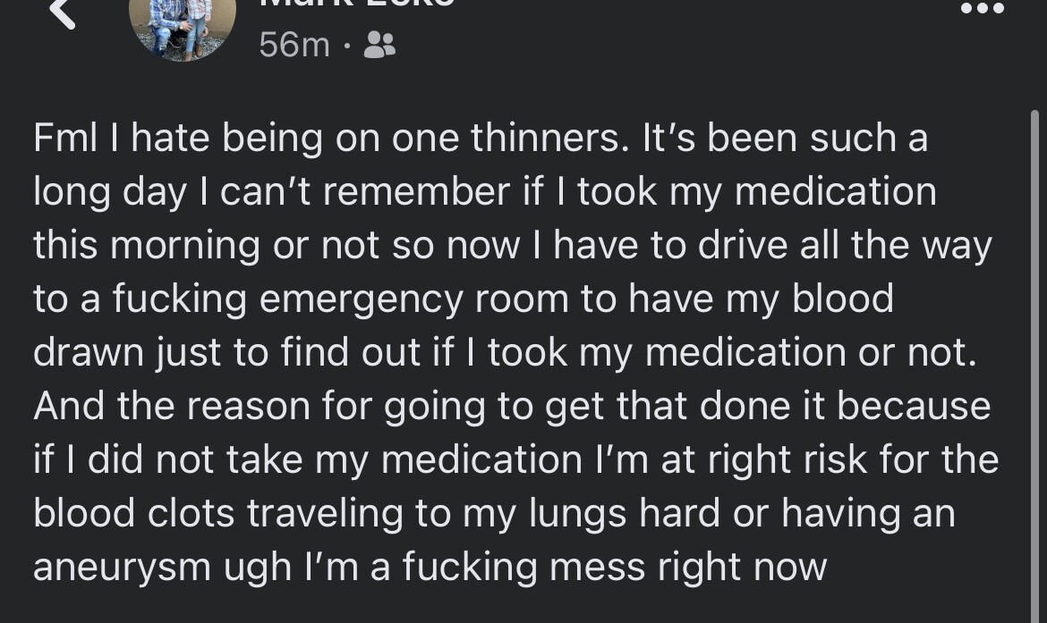 Echoes of my heart attack. Blood thinners. Today, I had the nosebleed that just kept on giving. After 4 hours a trip to Emergency, then another three hour extravaganza followed. Home now. But, seven hours for a simple nose bleed? Fuck you blood thinners. Oh wait, no, I love you.