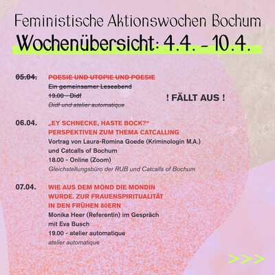 Es geht in eine neue Woche mit spannenden Veranstaltungen bei den feministischen Aktionswochen Bochum. Weitere Infos und Zoom Links wie immer hier: https://femwochenbo.wordpress.com/programm-2022/