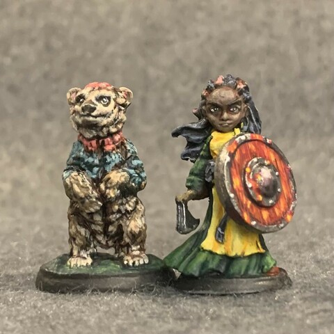 A Kid Hero and her partner from Reaper Miniatures’ #bones5. She painted her shield. She painted her bear. Got a problem with that? (The bear didn’t mind!)