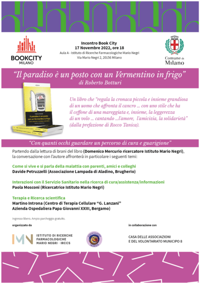 Giovedì 17 novembre alle ore 18, nell'ambito di #BookCityMilano l'Istituto di Ricerche Farmacologiche Mario Negri di Milano ospiterà la presentazione del libro di Roberto Botturi "Il paradiso è un posto con un Vermentino in frigo”.