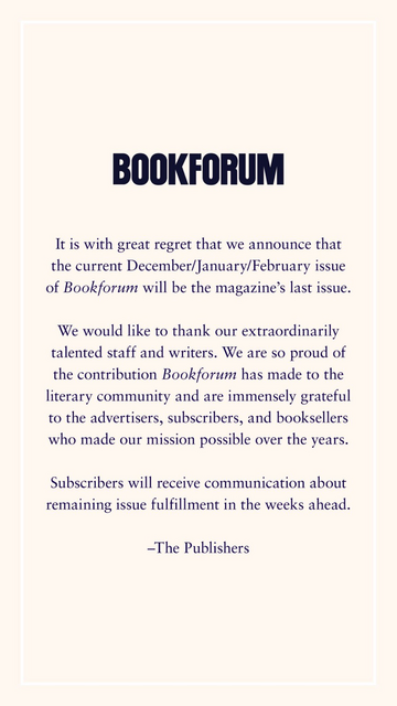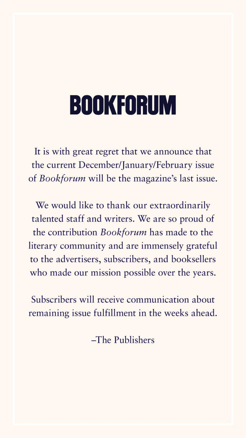 Bad news for authors and book lovers: #Bookforum magazine just announced on Twitter that it's shutting down.