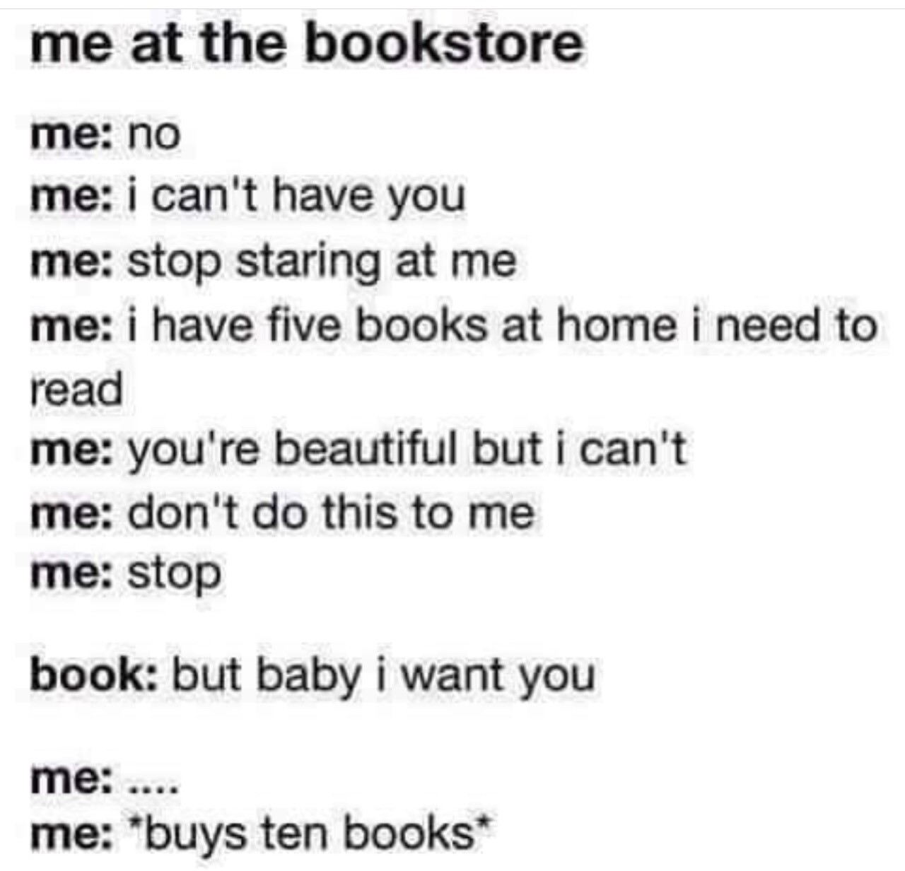 #booknerds - It’s so true it almost hurts. I go to the library to help reduce my spending on books - and check out a few. Then I walk into the library bookstore … and walk out with five more books. I cannot be trusted!!