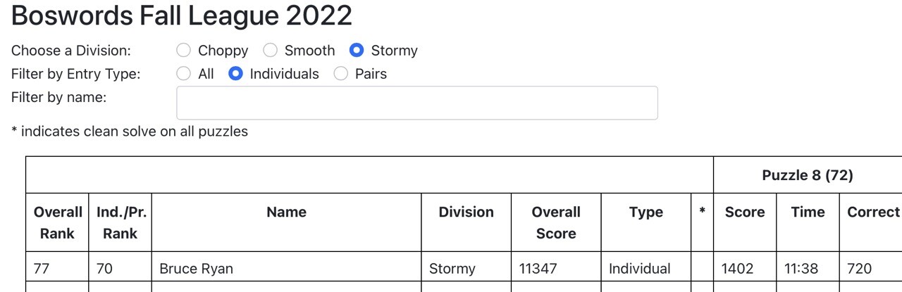 Pretty good finish in #Boswords 2022 Fall League #Crossword Tournament. 70th place/top third in hardest “Stormy” division is about right and I finished near folks who usually finish near me in #CrosswordTournaments 🤓