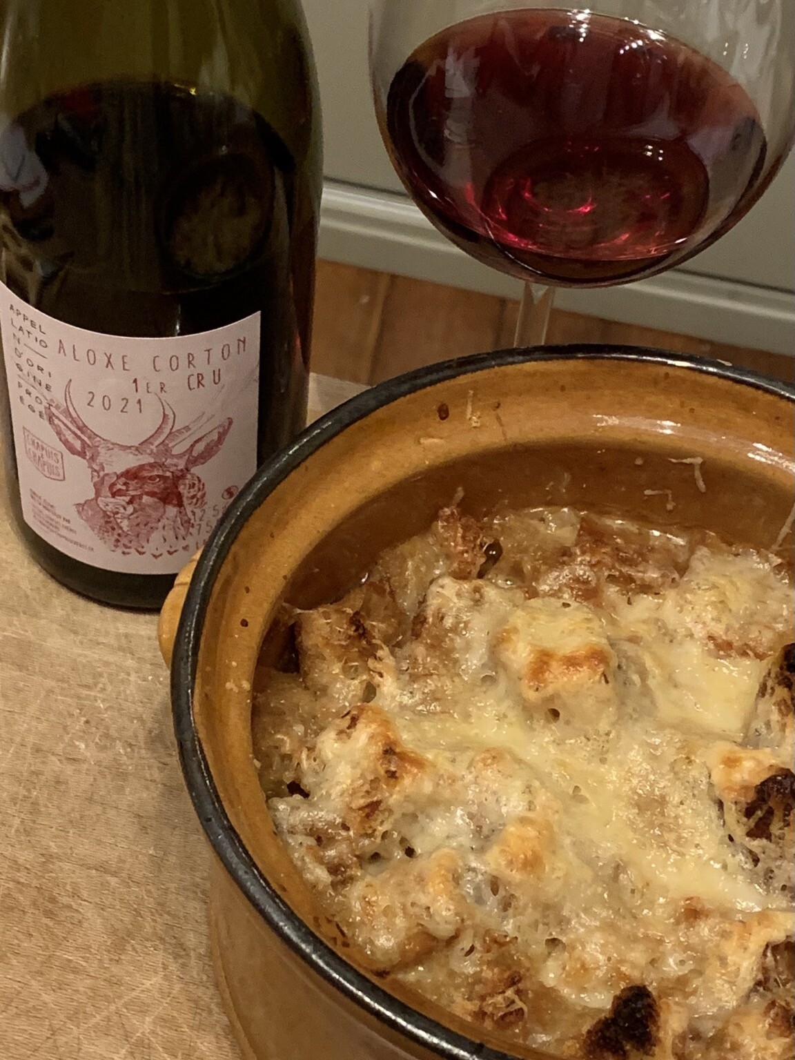 1st attempt at French onion soup was a delish success on a cold Friday night. Washed it down w/ a nice Aloxe-Corton 1er cru by Chapuis & Chapuis. #wine #cooking #bistro #bourgognewine #vinsdebourgogne