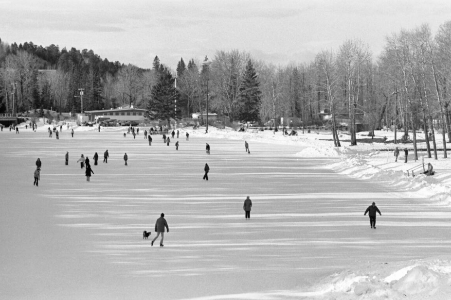 A group of people skate out on the Bowness lagoon in Calgary on Dec. 26, 1973. The weather was 0C, so it made for a nice mild day out on the ice.