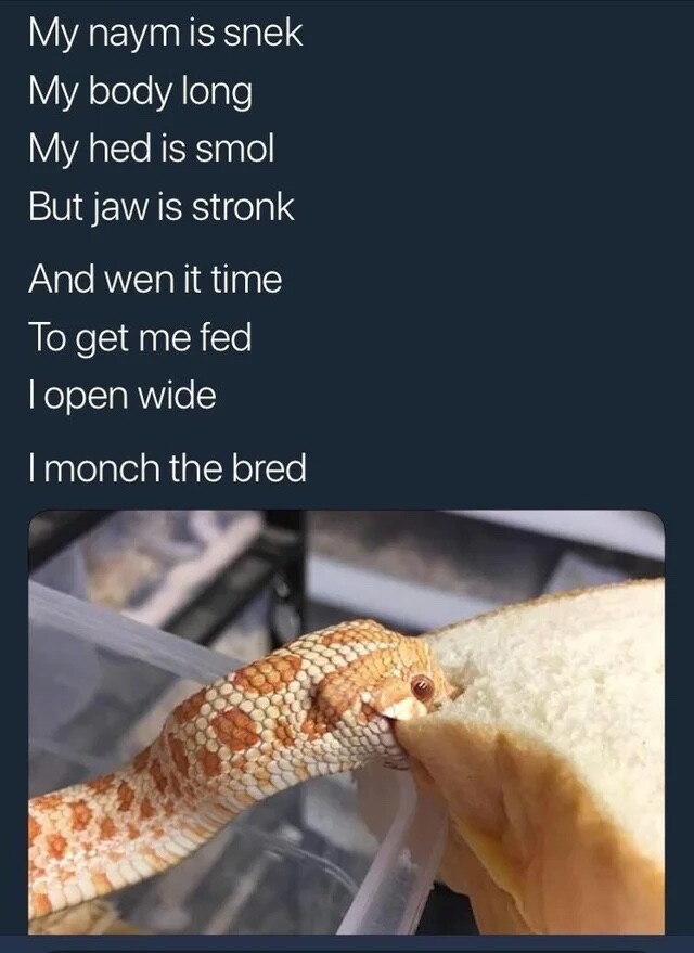 Good morning, friends! I hope you have a splendid day. Here is a Bredlik poem for you, starring a Smol Snek. (Grabbed from reddit)
