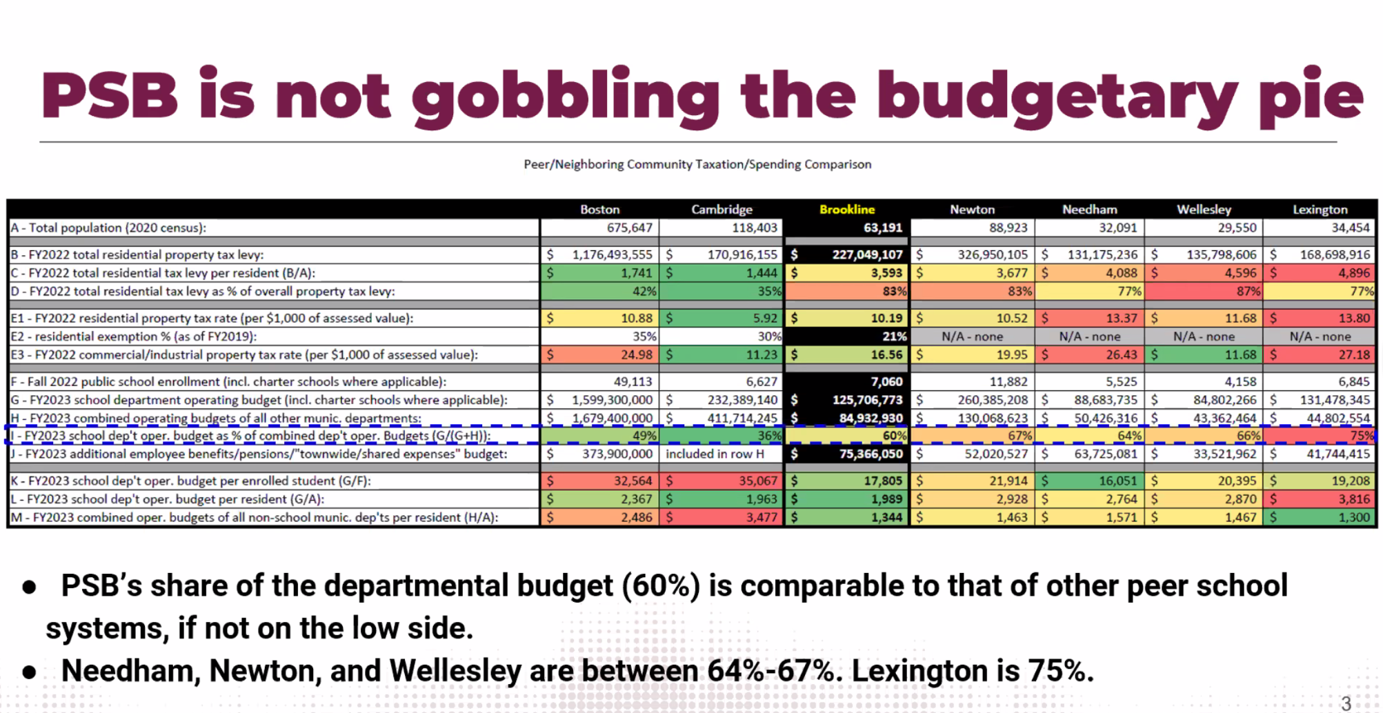 The last night of #BrooklineTownMeeting is underway. WA 37, a resolution for the finance committee to hire a consultant to review the school department budget, failed 58-179-8. It was a brazen attempt by the (appointed) finance committee to seize control of the school budget from the elected School Committee, with the intent to cut programs like METCO, over unhappiness that the schools take ~60% of the town budget, although that's in line with neighboring communities: