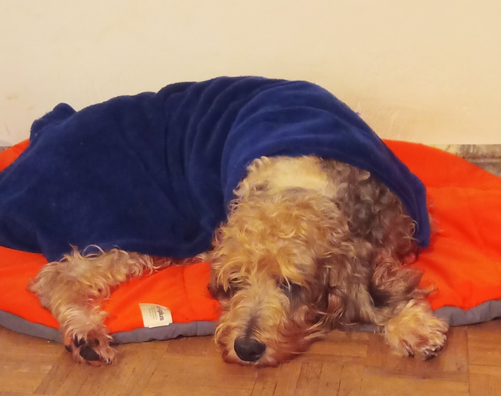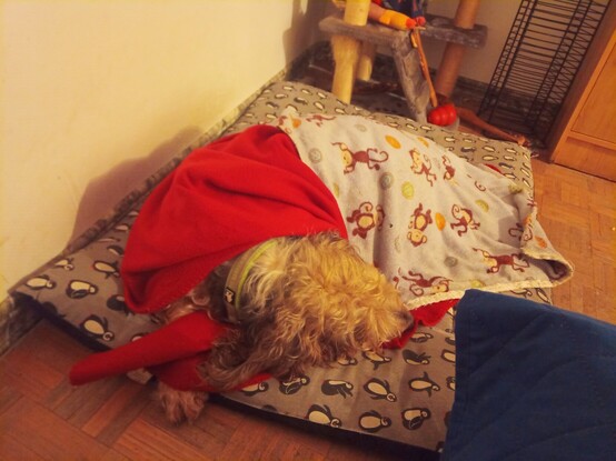 Están esperando a que salgan los resultados de unas pruebas que mandaron hoy al laboratorio para saber si tengo una cosa que se llama Cushing. Mañana me van a regalar un abrigo porque he perdido algo de pelo y hoy me han traído una mantita nueva. #Bruma